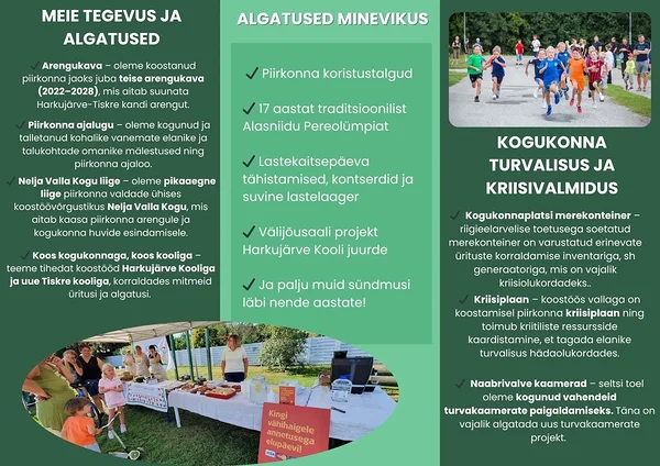 Soovime, et meie kogukond saaks eriolukordades ja kriisides paremini üksteist toetada. Selleks kaardistame kogukonna vahendid ja võimalused (nt - kes saab aidata transpordiga, kes omab generaatorit, kes oskab esmaabi jne).