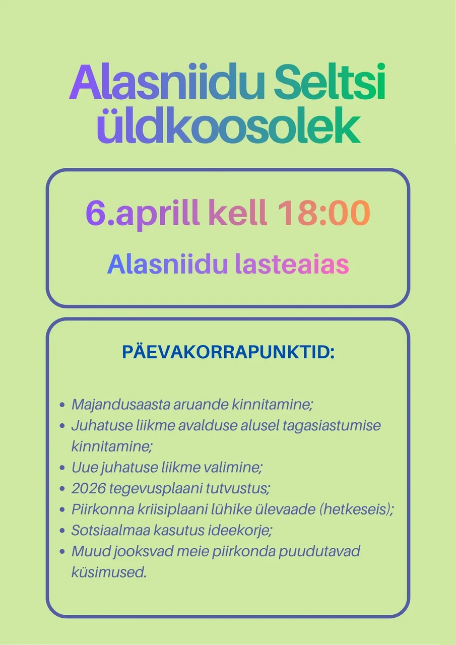 Euroopa Sotsiaalfond+ toetusmeede 4 „Sotsiaalse kaitse suurendamine“ 2025. aasta II taotlusvooru Alasniidu Seltsi poolt esitatud projekt "Terve ja tegus kogukond 55+ positiivsete emotsioonide töötubade II